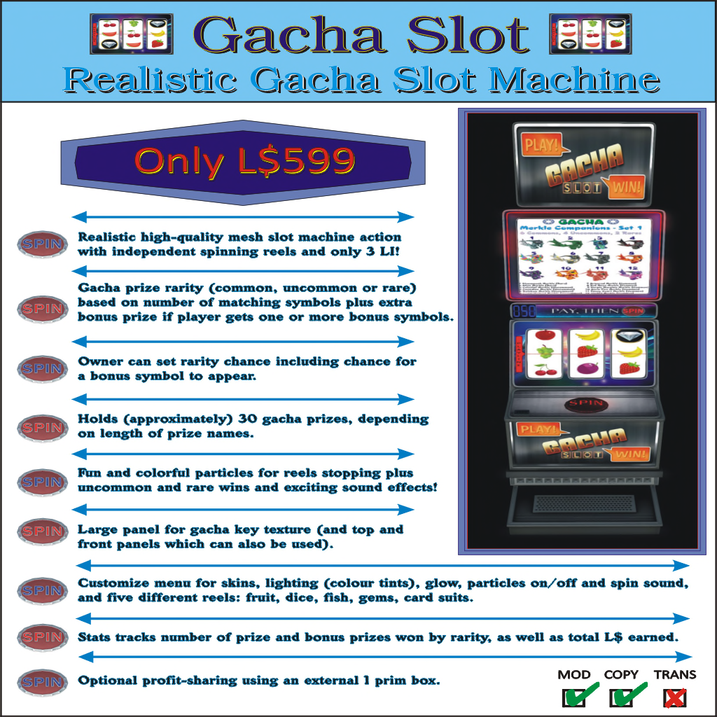IMPORTANT: The Gacha Slot is for original item creators and is NOT intended for use by gacha resellers. If the items you put inside are not copyable, you'll run into problems and find the machine trying to give out prizes that are no longer in its contents. Also, players need to be able to win any of the three rarities, so you must include one of each for it to function.