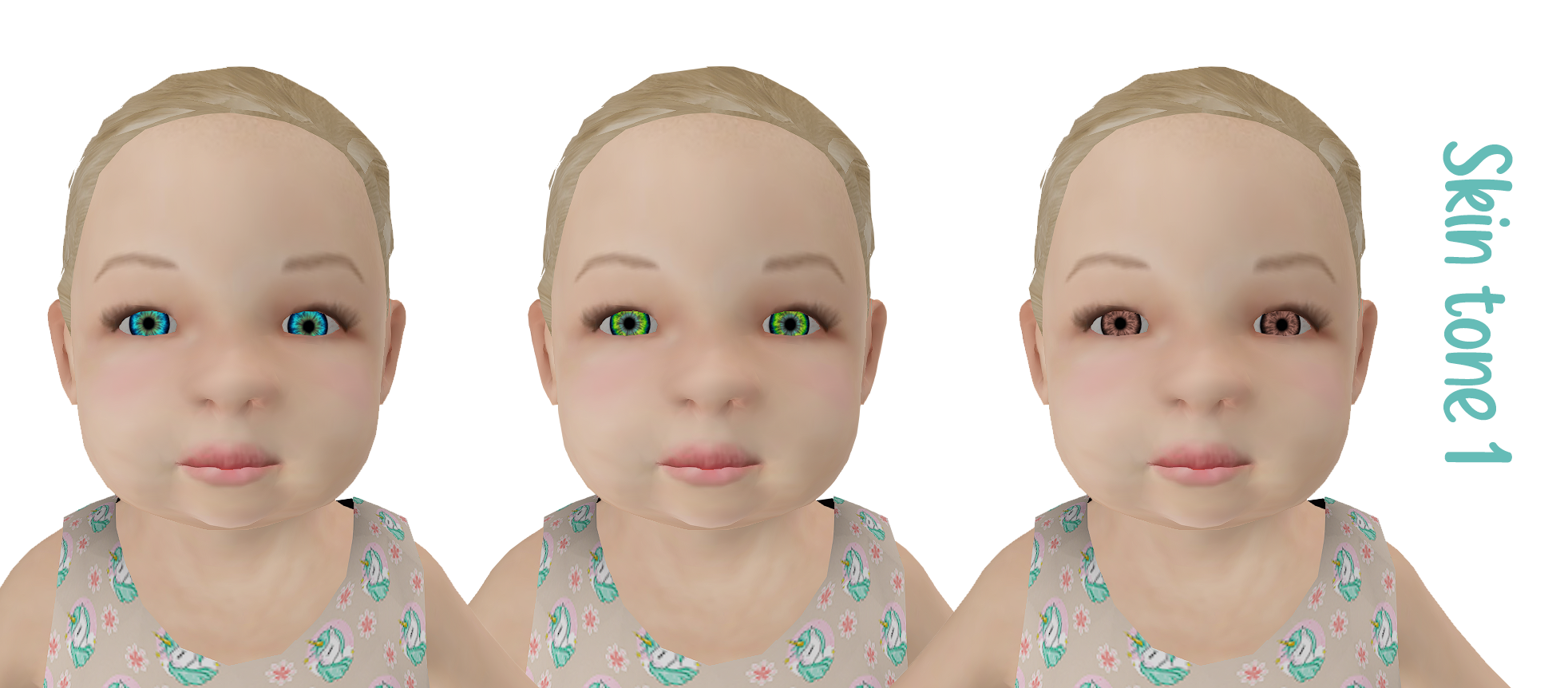 3 skin tones & 3 eye colours (blue, green, brown)